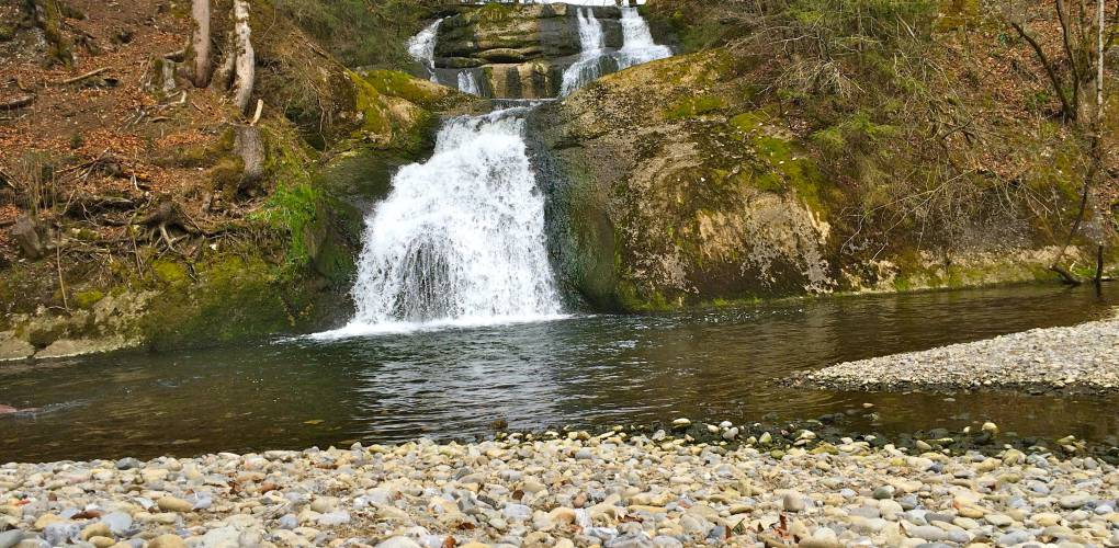 Erstmal geht es strammen Schrittes die Einfahrtsstraße hoch, ein wenig unter der B308 entlang und dann gehen wir unter der Unterführung der Hauptstraße durch und folgen eine Weile der wenig befahrenen Straße oberhalb nach links. Nach einiger Zeit wenden wir uns rechts und gleich nochmal nach rechts (Laufenegg) und folgen der Straße bis zu einem Waldweg am Eibele-Bach entlang.