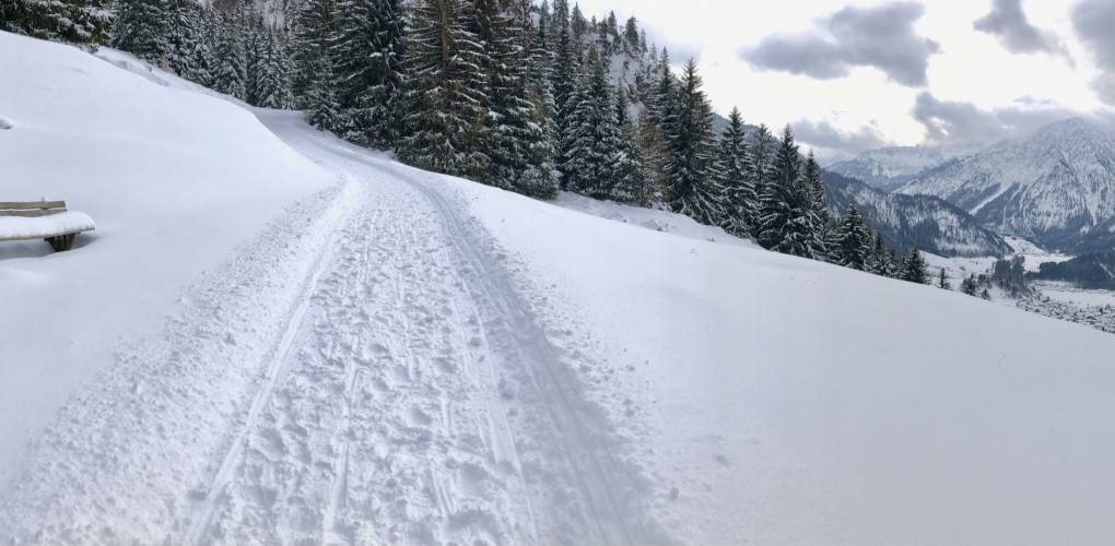 Wer vom Hotel aus kam, kann am Parkplatz die Jochstraße vorsichtig überqueren und dem kleinen Trampfelpfad folgen. Dieser bringt Sie zurück zur alten Jochstraße, die man auch hervorragend runterrodeln kann.